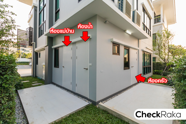 ส่วนผนังด้านนอกฉาบเรียบทาสีให้ปกติ ห้องแม่บ้านและห้องน้ำแม่บ้าน จะวางตัวอยู่ข้างบ้าน หากจะเข้าห้องครัวก็มีประตูด้านหลังให้เข้าได้สะดวก ไม่ต้องเข้าผ่านหน้าบ้าน