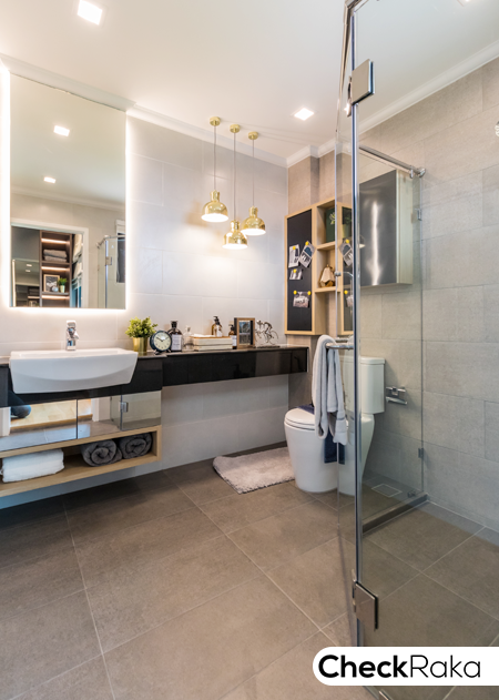 จัดวางฟังก์ชั่นตามรูป เริ่มจากซ้ายมือ เป็นอ่างล้างหน้าพร้อมเคาน์เตอร์วางของและบานปิด ตรงกลางคือโถสุขภัณฑ์