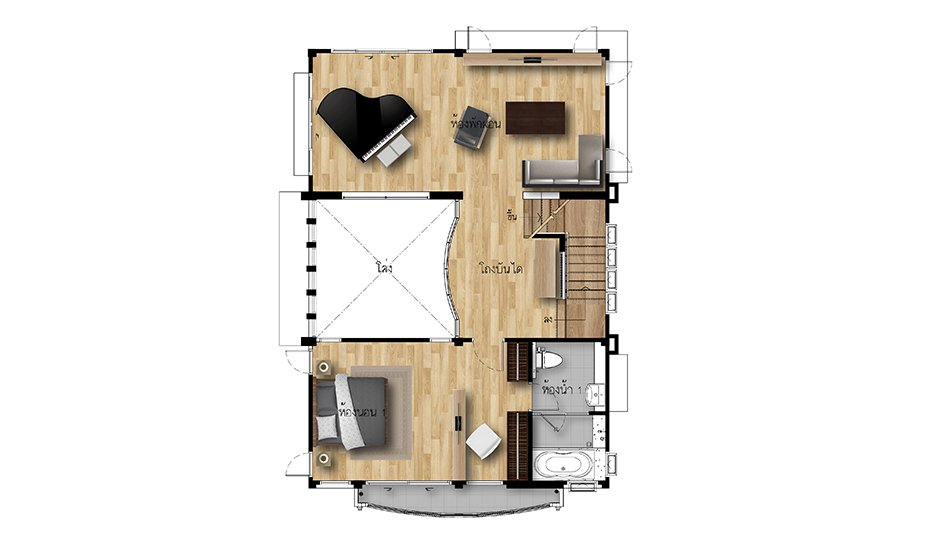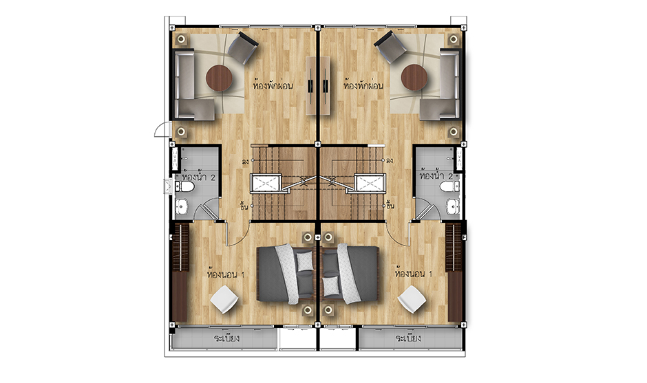 บนโถงชั้น 2 ตรงหน้าห้องนอน 4 สามารถจัดวางโซฟานั่งเล่น เป็นมุมเล็กๆ แบบนี้ได้นะคะ