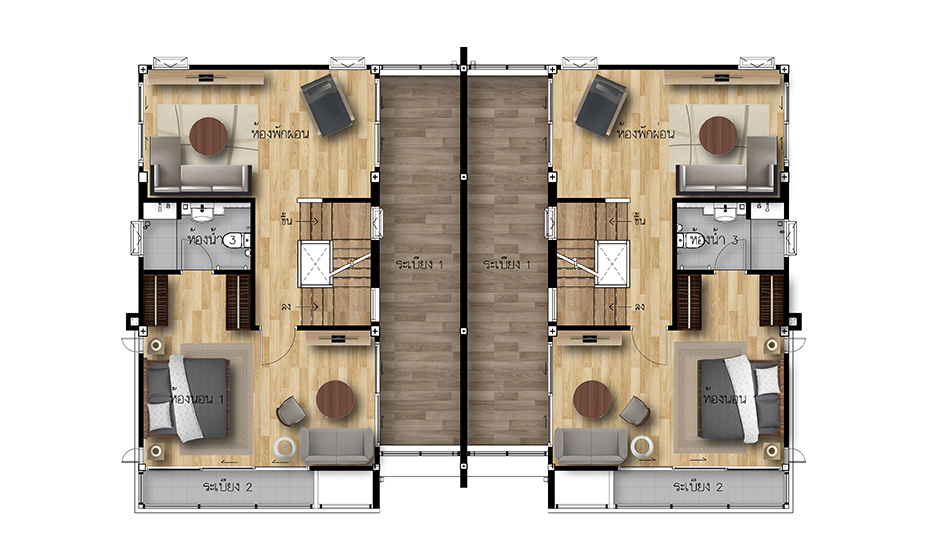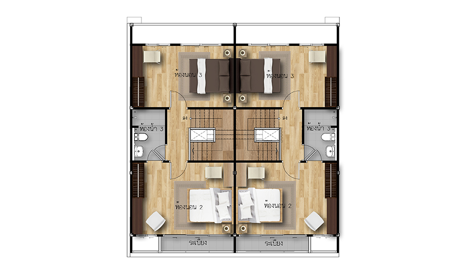 ห้องนอนนี้มีขนาดเท่ากันกับห้องนอนชั้น 2 ฟังก์ชันใช้สอย และการตกแต่งก็คล้ายๆกัน