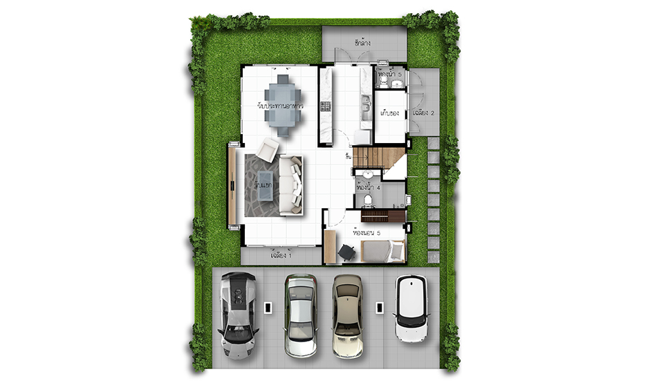 3. แบบบ้าน ศุภศิริ - บ้านเดี่ยว 3 ชั้น กว้างขวางด้วยพื้นที่ใช้สอย 321 ตร.ม. Function รองรับครอบครัวขนาดใหญ่ ถึง 5 ห้องนอน 4 ห้องน้ำ 1 ห้องพักผ่อนส่วนตัวชั้น 2 ที่จอดรถ 4 คัน พร้อมห้องแม่บ้านและห้องน้ำ โอ่โถงด้วย ห้องรับแขก Grand Vertical Living Room สูง 6 เมตร