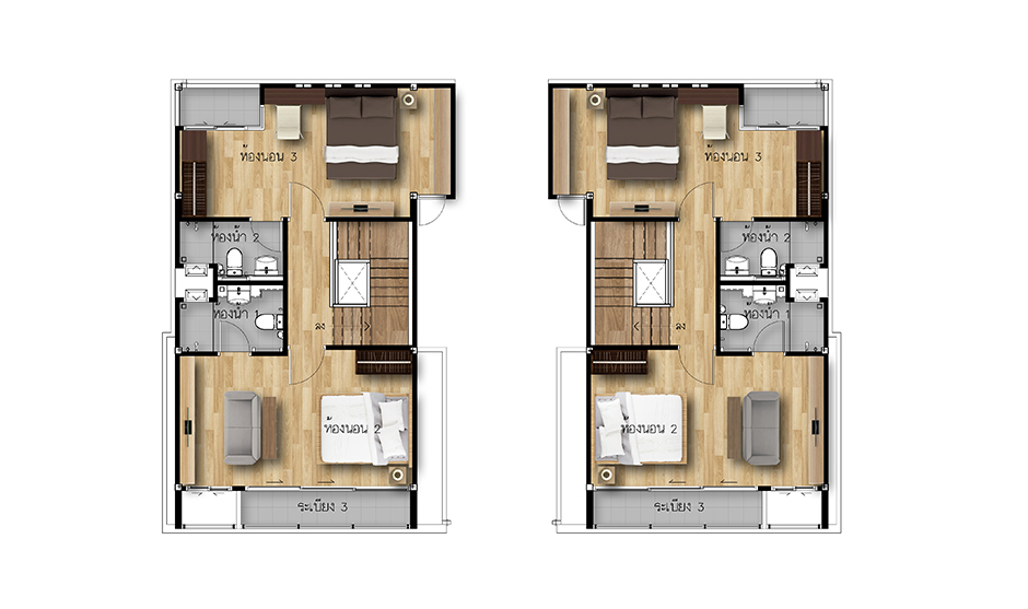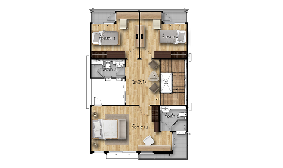 ฟังก์ชั่นชั้น 3 เริ่มจากซ้ายมือ คือห้องนอน 2 จากนั้นเป็น Sky Terrace ถัดมาคือ ห้องน้ำ และ ห้องนอน 3