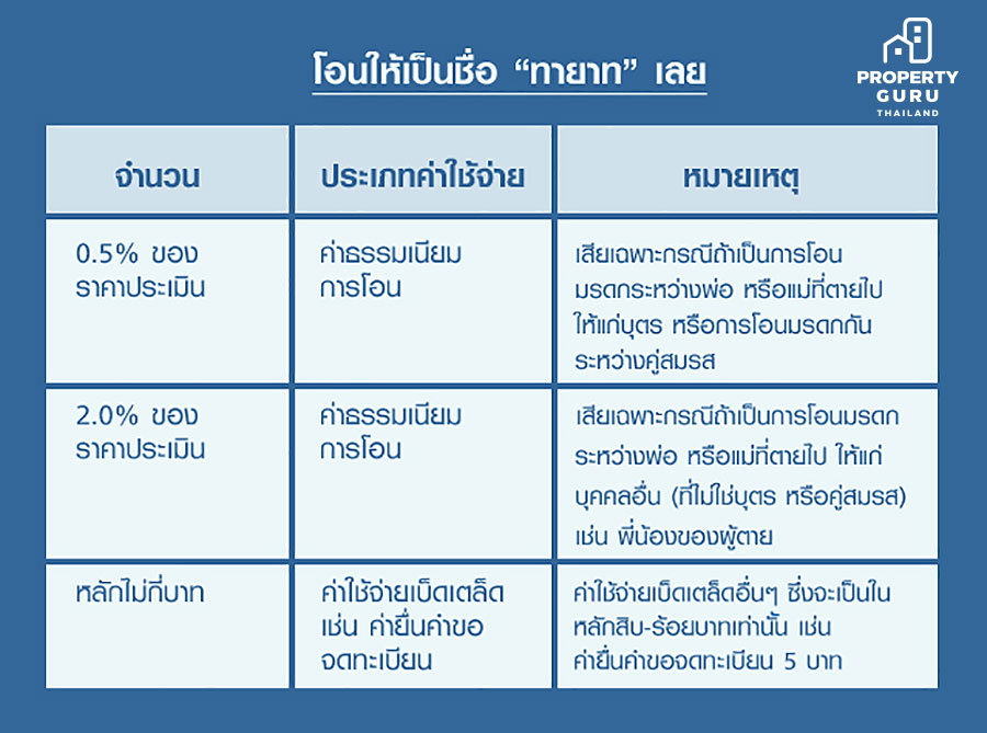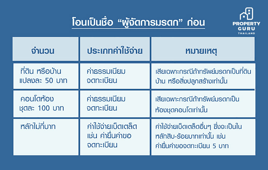 (ก) วิธีแรก - ให้ผู้จัดการมรดกเดินเรื่อง จดทะเบียนโอนมรดก (โดยมีผู้จัดการมรดก) บ้านหรือคอนโดนั้นให้เป็นชื่อของ "ทายาท" เลย โดยจะต้องทำตามขั้นตอนของกรมที่ดิน ส่วนค่าใช้จ่าย และค่าธรรมเนียมจะเป็นดังนี้