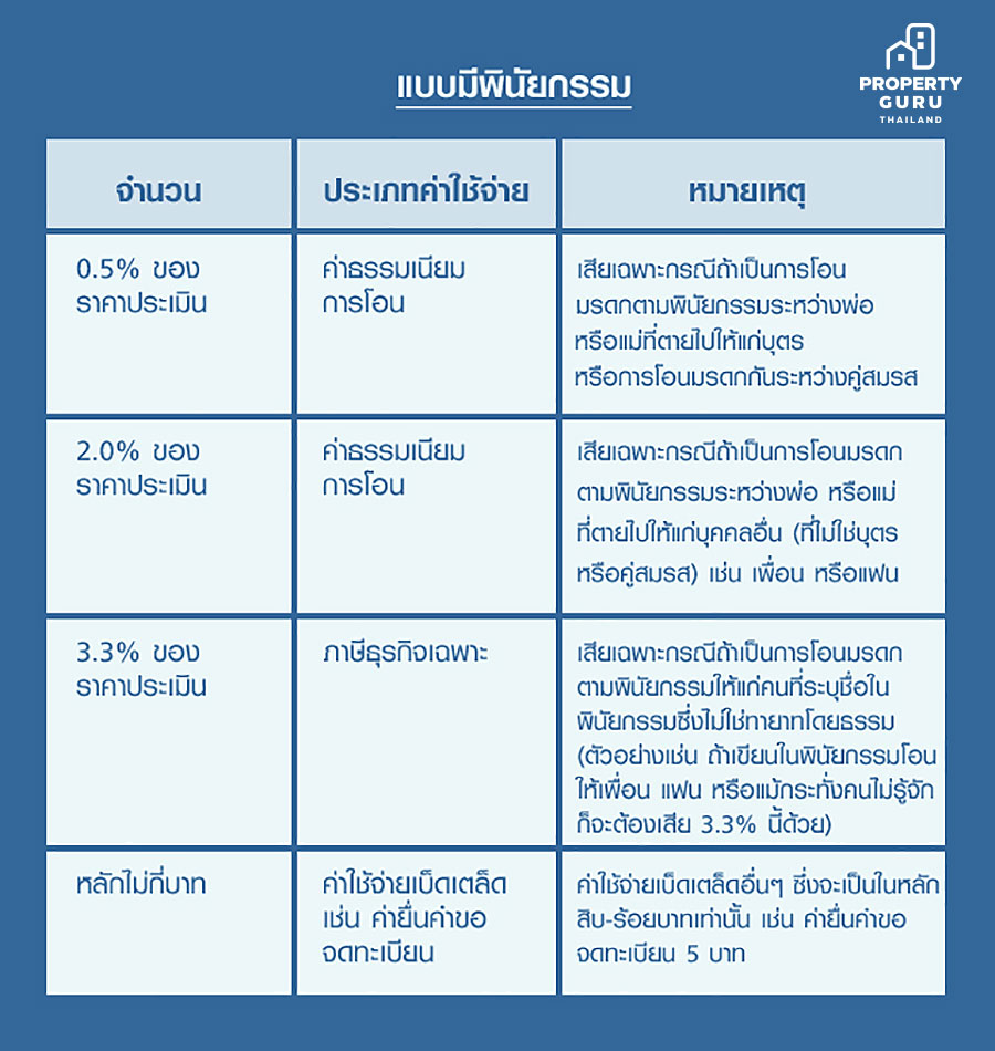 ถ้าเจ้าของคอนโดหรือบ้าน ทำพินัยกรรมไว้ว่าบ้าน หรือคอนโดหลังนั้นๆ จะให้ใคร (โดยไม่ได้ตั้งผู้จัดการมรดก) คนๆ นั้นก็จะมีสิทธิได้รับบ้าน หรือคอนโดมรดกนั้น โดยวิธีการก็คือผู้รับพินัยกรรมก็แค่ไปยื่นคำขอ และปฏิบัติตามขั้นตอนของกรมที่ดิน (เช่น ต้องประกาศการขอรับมรดก 30 วัน หากไม่มีใครคัดค้านในช่วงประกาศ 30 วันนั้น ก็ไปจดทะเบียนโอนมรดกได้เมื่อพ้นกำหนด 30 วัน) ส่วนค่าธรรมเนียม และค่าใช้จ่าย จะเป็นดังต่อไปนี้
