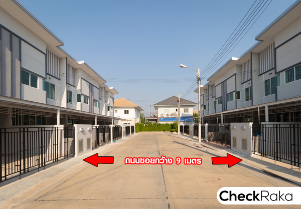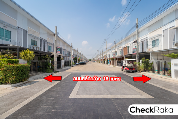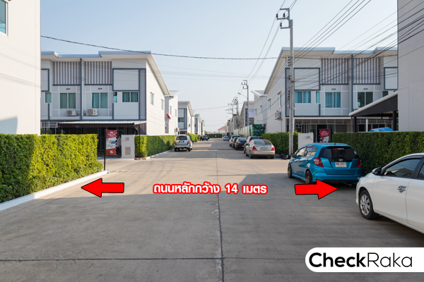 ถนนหลักช่วงโซนด้านหลังโครงการกว้าง 14 เมตร จอดรถแล้วทั้งสองฝั่ง ยังสามารถวิ่งสวนกันได้