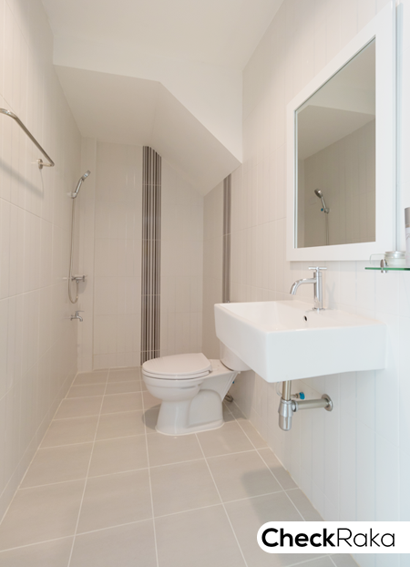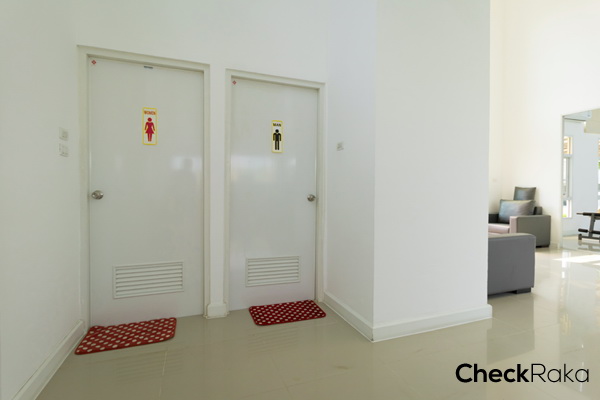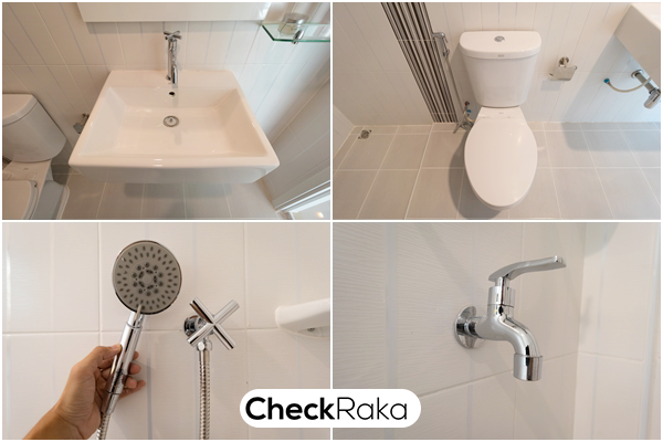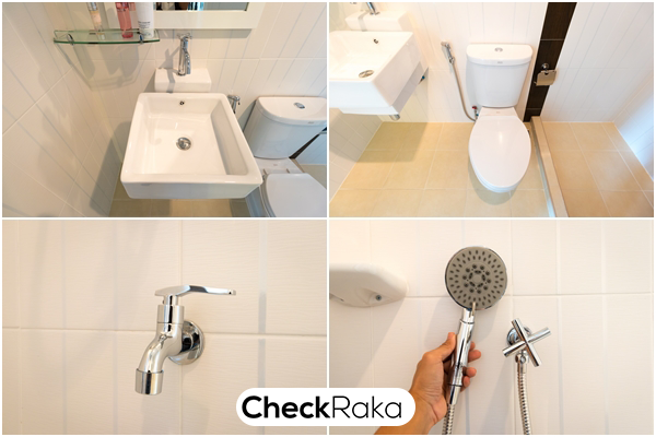 ห้องน้ำชั้นนี้จัดวางสุขภัณฑ์มาให้ครบ ทั้งอ่างล้างมือ ก๊อกน้ำ กระจก โถสุขภัณฑ์ และติดตั้งฝักบัวมาให้