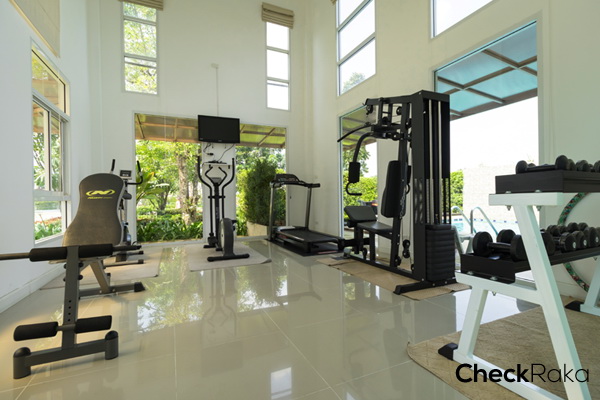 ห้องฟิตเนสที่นี่มีเครื่องเล่นอยู่ครบครัน มีกระจกอยู่รอบด้านสามารถมองเห็นวิวสระว่ายน้ำ