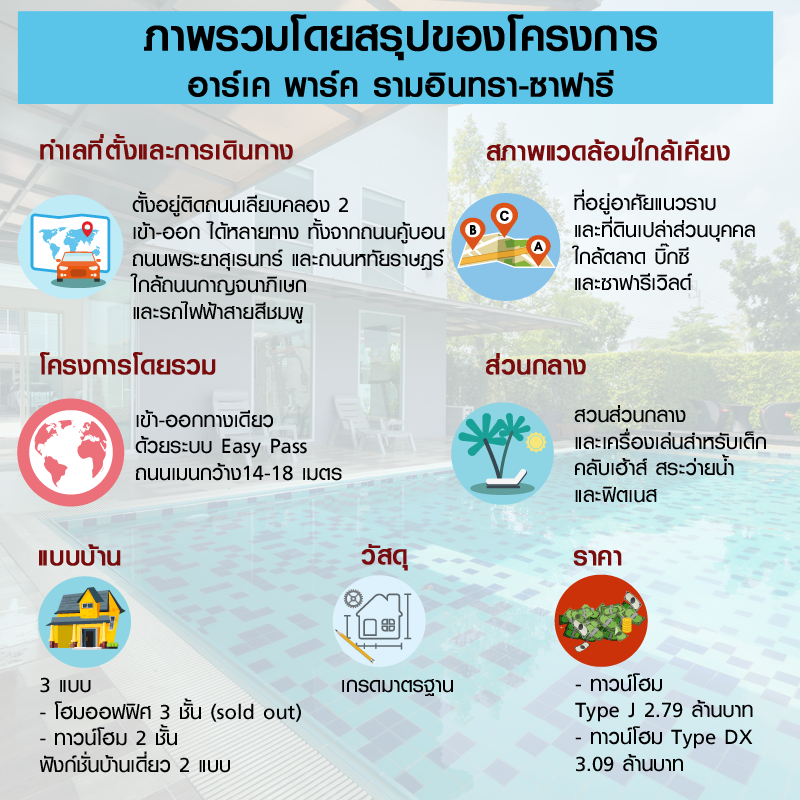 โครงการ อาร์เค พาร์ค รามอินทรา-ซาฟารี (RK Park Ramindra - Safari) เป็นโครงการที่มีทั้งทาวน์โฮม 2 ชั้น และโฮมออฟฟิศ 3 ชั้น ทางเข้า-ออกของโครงการ มีทางเข้า-ออกหลักเพียงทางเดียวซึ่งติดกับถนนเลียบคลองสอง ด้านหน้าสุด ตรงประตูทางเข้า-ออก และ 2 บล็อคแรก จะเป็นโฮมออฟฟิศขนาด 3 ชั้น หลังจากนั้นเป็นทาวน์โฮมขนาด 2 ชั้น โครงการตั้งอยู่บนแปลงที่ดินขนาด 31 - 2 - 51.2 ไร่ ตารางวา จำนวนบ้านรวมทั้งหมด 302 หลัง มีพื้นที่สีเขียวเป็นสวนส่วนกลาง ทำทางเดินภายในสวนให้มีเครื่องเล่นสำหรับเด็ก พร้อมคลับเฮ้าส์และสระว่ายน้ำ ตั้งอยู่ช่วงกลางของโครงการถัดจากวงเวียน มีถนนหลักกว้าง 14-18 เมตร และถนนซอยย่อยอื่นๆ กว้าง 9 เมตร