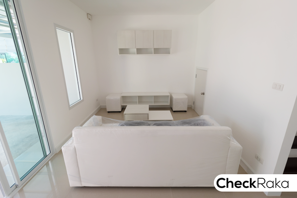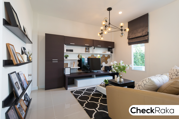 เปรียบเทียบให้เห็นถึงเฟอร์นิเจอร์ Built-in ที่ลูกค้าจะได้รับจริง มีโซฟายาว สตูลนั่ง 2 ที่ โต๊ะวางของ ชั้นวางทีวี