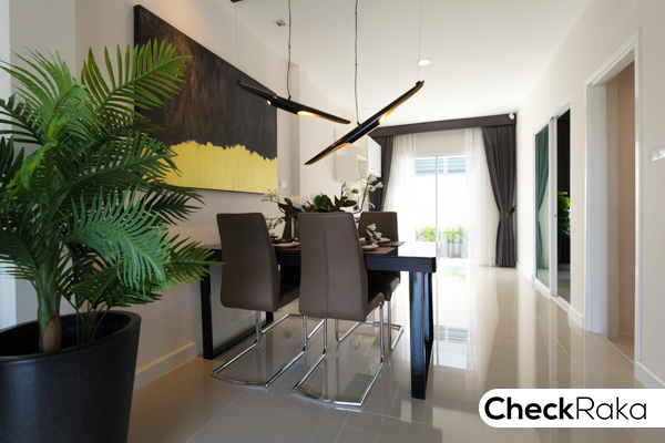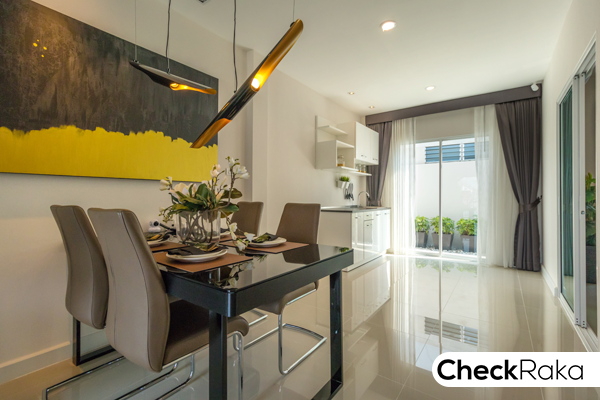 ถัดมาคือพื้นที่รับประทานอาหาร พื้นที่ส่วนนี้จะยาวต่อเนื่องมาจากโถงด้านหน้า สามารถวางโต๊ะขนาด 4 ที่นั่งได้