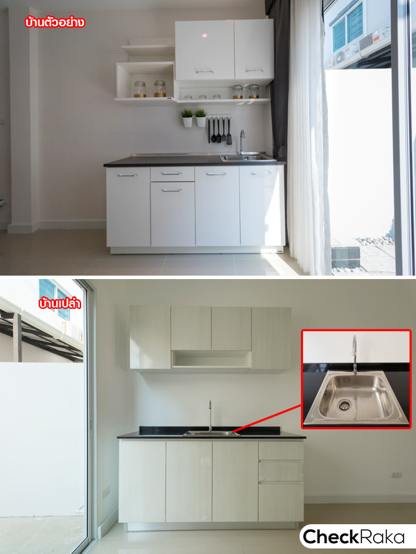 ภาพมุมนี้จะมองเห็นเคาน์เตอร์ครัวเปรียบเทียบกันระหว่างบ้านตกแต่งกับบ้านเปล่าที่ทางโครงการแถมมาให้