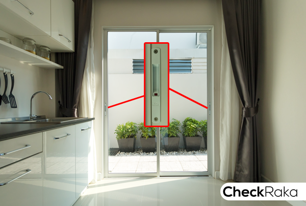 ประตูทางเข้าหลักเป็นประตูบานเลื่อนคู่ เปิดได้ทั้งสองด้าน กรอบอลูมิเนียมสีขาว กระจกเขียวตัดแสงทั้งหลัง