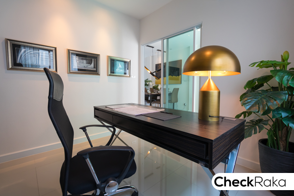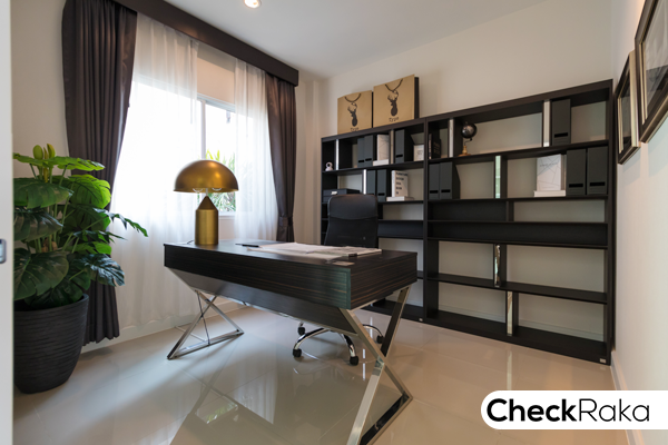 บ้านตัวอย่างตกแต่งไว้เป็นห้องทำงาน มีหน้าต่างบานเลื่อนให้ 1 บาน เปิดระบายอากาศได้ค่ะ