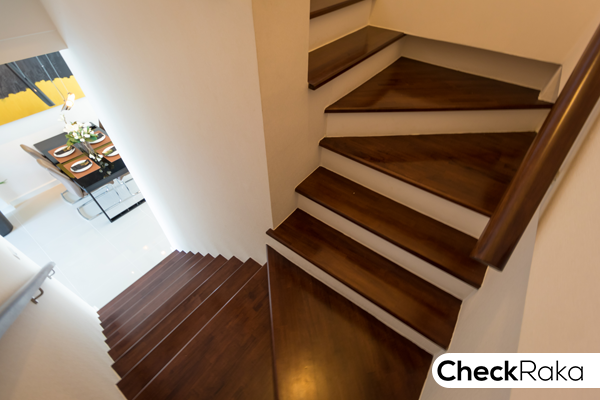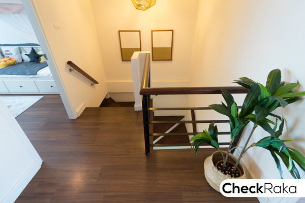 บันไดทางขึ้นชั้น 2 เป็นบันไดโครงสร้างเหล็ก พื้นบันไดไม้แผ่นสีเข้มแบบนี้เลยค่ะ