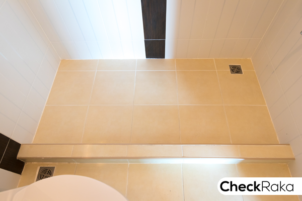 2.7 เมตร ปูด้วยกระเบื้องแกรนิตโต้ 60 x 60 ซม. ไฟด้านล่างเป็นโคมไฟดาวน์ไลท์ ฝ้าที่ให้เป็นฝ้าเรียบ