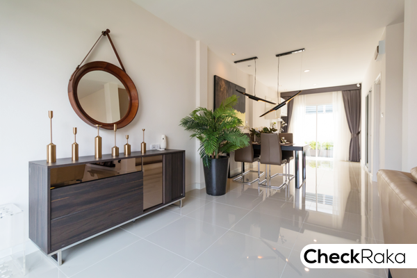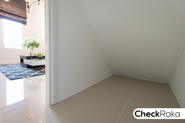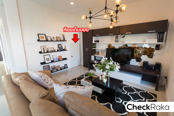 เข้ามาด้านในตัวบ้าน จะเห็นว่าฝั่งซ้ายมือสามารถจัดเป็นตู้โชว์ หรือ ตู้วางรองเท้าก็ได้ ชั้นล่างมีความสูงจากพื้นถึงเพดาน