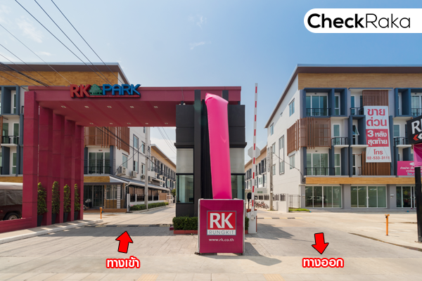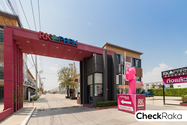 มาดูซุ้มประตูโครงการมีขนาดใหญ่ พร้อมชื่อโครงการ RK PARK ดีไซน์สวย โทนสีชมพูสดใสตัดกับสีดำ