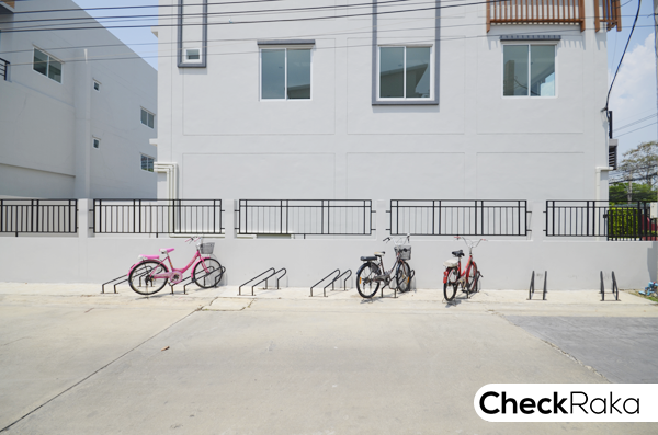 ผ่านซุ้มประตูเข้ามาในโครงการ จะเห็นจุดจอดรถจักรยานอยู่ฝั่งขวามือ