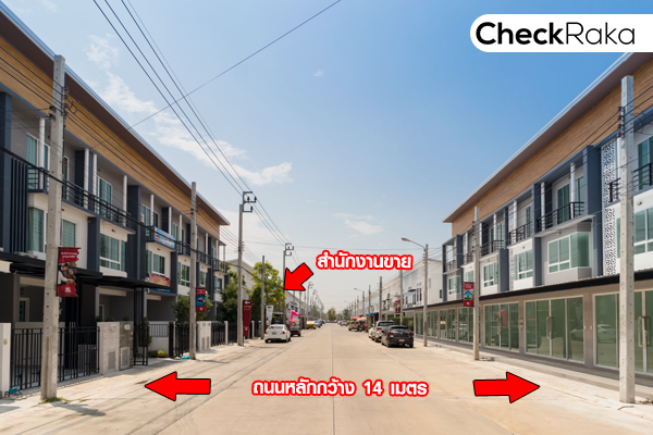 ถนนหลักช่วงต้นโครงการกว้าง 14 เมตร ซึ่งเป็นที่ตั้งของทาวน์โฮม 3 ชั้น ถัดจากทาวน์โฮม 3 ชั้น