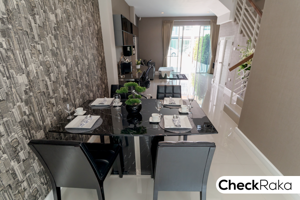 ถัดจากส่วนรับแขก จะเป็นพื้นที่สำหรับวางโต๊ะรับประทานอาหาร