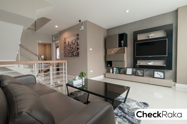 ฝั่งตรงข้ามโซฟารับแขก เป็นพื้นที่สำหรับจัดวางทีวี หรือตกแต่งเป็นชั้นวางของก็ได้ ระยะโซฟากับทีวีนี่กว้างมาก