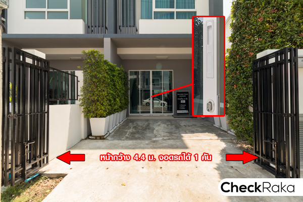 บ้านแบบนี้มีหน้ากว้าง 4.4 เมตร จอดรถได้ 1 คัน พื้นจอดรถจะเป็นคอนกรีตเสริมเหล็กขัดหยาบลาดยาวจนถึงประตูรั้ว
