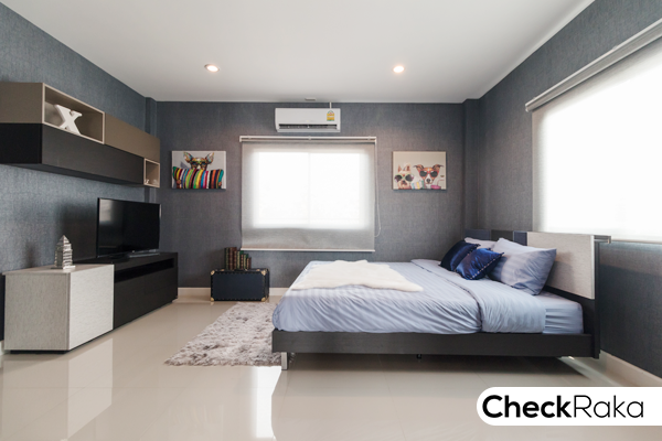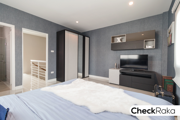 วางเตียงแล้วยังมีพื้นที่ปลายเตียงเหลืออยู่กว้างมาก สามารถจัดวางตู้เสื้อผ้าแบบบ้านตัวอย่าง โต๊ะวางทีวี
