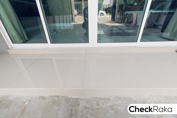 เฉลียงหน้าบ้านจะยกสูงจากพื้นลานจอดรถเล็กน้อย และปูกระเบื้องให้ กรอบประตูอลูมิเนียมสีขาว กระจกเขียวตัดแสง
