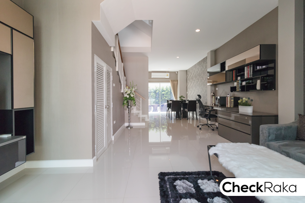 เปิดประตูเข้ามาจะเห็น โถงชั้น 1 ยาวไปจนสุดผนังด้านหลังเลยค่ะ พื้นชั้นนี้ปูด้วยกระเบื้องแกรนิตโต้ 60 x 60 ซม.