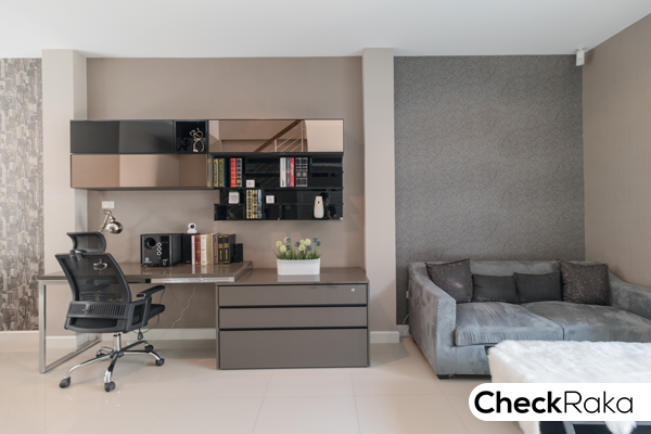 ส่วนพักผ่อนรับแขกจัดวางไว้ด้านหน้า สามารถวางโซฟาขนาด 3-4 ที่ และจัดพื้นที่ด้านข้างโซฟาเป็นโต๊ะทำงาน