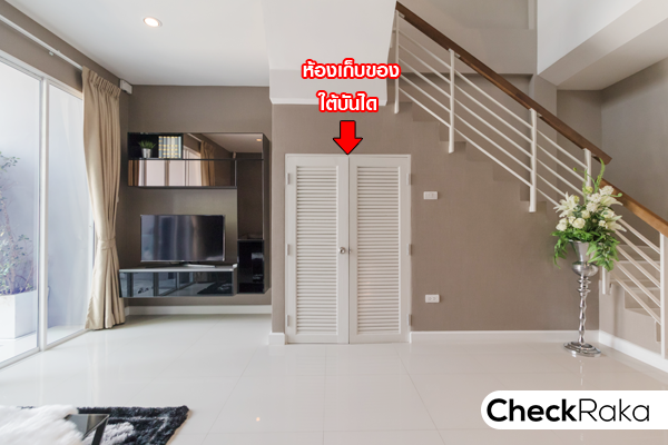 เลยทีเดียว ถัดจากพื้นที่วางทีวีเป็นห้องเก็บของใต้บันได