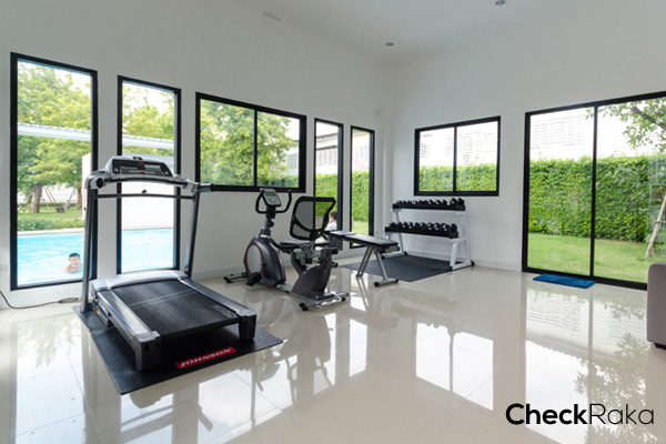 เครื่องเล่นฟิตเนสหันหน้าไปทางสระว่ายน้ำ มีเครื่องเล่นอยู่พอประมาณ