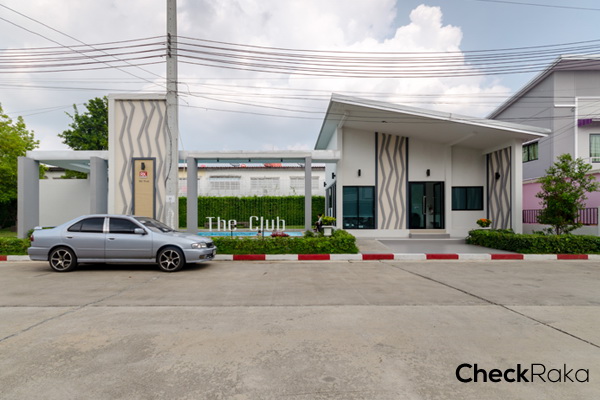 ด้านหน้าทางเข้าคลับเฮ้าส์หน้าตาประมาณนี้ค่ะ เขียนป้ายไว้ว่า The Club
