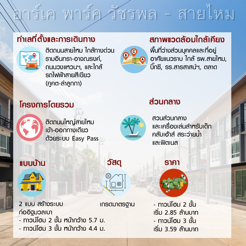 โครงการ อาร์เค พาร์ค วัชรพล - สายไหม (RK Park Watcharaphol - Saimai) เป็นโครงการบ้านรูปแบบใหม่ที่มีทั้งทาวน์โฮม 2 ชั้น และทาวน์โฮม 3 ชั้น ทางเข้า-ออกของโครงการมีทางเข้า-ออกหลักเพียงทางเดียว คือ ติดถนนสายไหม โครงการนี้อยู่บนแปลงที่ดินขนาด 17-3-86 ไร่ มีจำนวนบ้านรวมทั้งหมด 173 หลัง สำหรับสิ่งอำนวยความสะดวกภายในโครงการ มีพื้นที่สีเขียวเป็นสวนสาธารณะส่วนกลาง พร้อมคลับเฮ้าส์ สระว่ายน้ำ และเครื่องออกกำลังกาย ซึ่งตั้งอยู่บริเวณช่วงกลางของโครงการ รั้วรอบโครงการมีความสูงอยู่ที่ 2-3 เมตร พร้อมเหล็กแหลม ถนนเมนกว้าง 12-14 เมตร ไม่มีถนนซอยย่อยค่ะ