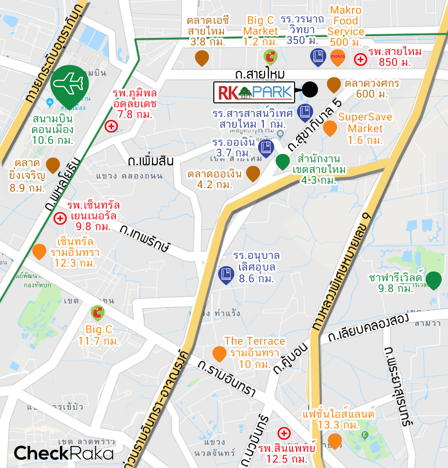 โครงการ อาร์เค พาร์ค วัชรพล - สายไหม (RK Park Watcharaphol - Saimai) ตั้งอยู่บนถนนสายไหม แขวงสายไหม เขตสายไหม กรุงเทพมหานคร 10220 โดยย่านสายไหมนี้ถือว่าเป็นย่านชุมชนยอดฮิตเลยทีเดียวค่ะ มีหมู่บ้านจัดสรรอยู่ย่านนี้หลากหลายโครงการ ทำให้สิ่งอำนวยความสะดวกบริเวณนี้ค่อนข้างจะครอบคลุมในทุกรอบด้าน มีทั้งโรงเรียนสารสาสน์วิเทศสายไหม ที่อยู่ติดกับโครงการเลยทีเดียว และมีตลาดล้อมรอบอยู่ทุกทิศทาง