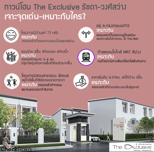 โครงการ The Exclusive รัชดา-วงศ์สว่าง พร้อมเปิดให้ลูกค้าเข้าเยี่ยมชมบ้านตัวอย่าง สามารถเข้าชมได้ทุกวัน โดยปัจจุบันมียอดการจองซื้ออยู่ที่ 50%