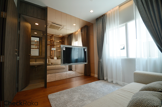 ห้องนอนขนาดกลางพร้อมห้องน้ำส่วนตัวที่ชั้น 2 ทางโครงการแต่งโชว์ไว้เป็นห้องพักผ่อนดูหนัง
