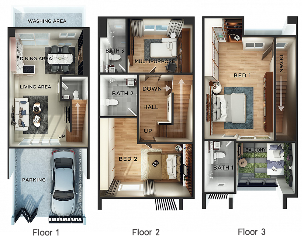 - แบบบ้าน : ทาวน์โฮม 3 ชั้น 3 ห้องนอน 4 ห้องน้ำ 2 ที่จอดรถ/ แบบหน้ากว้าง 5 เมตร และ 5.5 เมตร