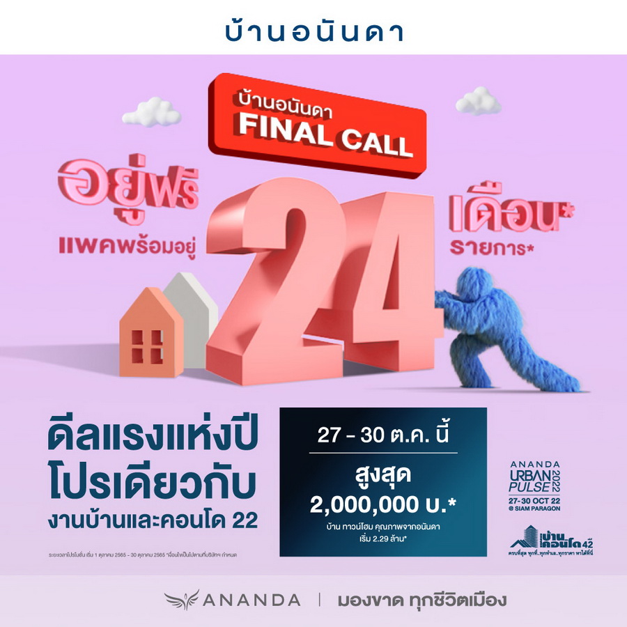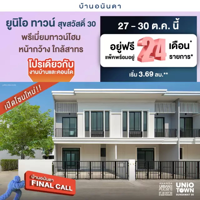 พรีเมี่ยมทาวน์โฮมพร้อมอยู่จาก อนันดา ดีเวลลอปเม้นท์ ให้อิสระในการใช้ชีวิต ผสมผสานความเป็นส่วนตัว เพียบพร้อมด้วยพื้นที่สีเขียวขนาดใหญ่ สัมผัสใกล้ชิดธรรมชาติ บนพื้นที่ความสุขที่คุณสร้างได้ พิเศษภายในงาน มหกรรมบ้านและคอนโด 27 - 30 ต.ค. 65 นี้ อยู่ฟรี 24 เดือน* แพ็คพร้อมอยู่ 24 รายการ* เริ่ม 3.69 ล้านบาท
