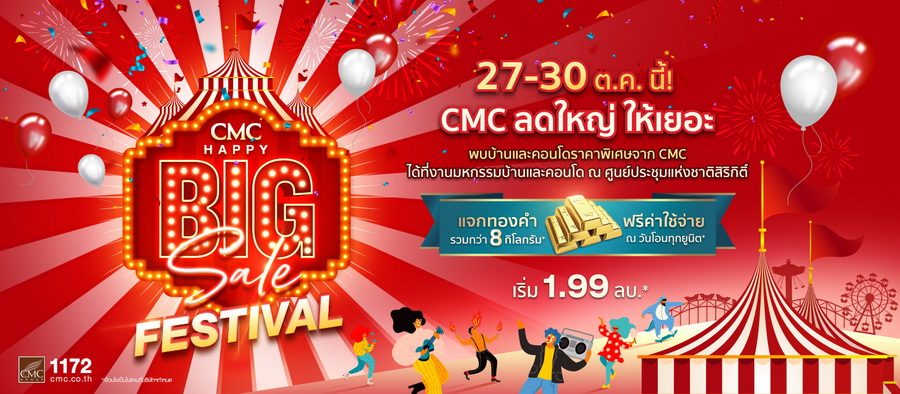 พบกับโปรโมชั่นพิเศษภายในงานมหกรรมบ้านและคอนโด ครั้งที่ 42 BIG SALE พบบ้านและคอนโดลดจัดหนักพิเศษจาก CMC ครบจบทุกโครงการ ทุกทำเล ใกล้รถไฟฟ้า BTS/MRT และใกล้ทางด่วน โปรสุดพิเศษเฉพาะในงาน แจกใหญ่แจกเยอะ BIG BONUS เเจกทองคำรวมกว่า 8 กิโลกรัม* ฟรีค่าใช้จ่าย ณ วันโอนทุกยูนิต* BIG SURPRISE ลุ้นส่วนลด ON TOP สูงสุด 50,000 บาท* เฉพาะงานนี้เท่านี้