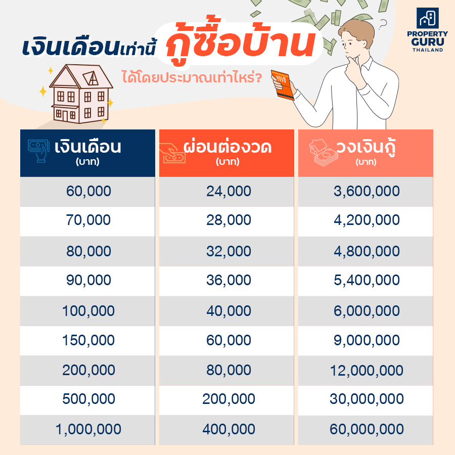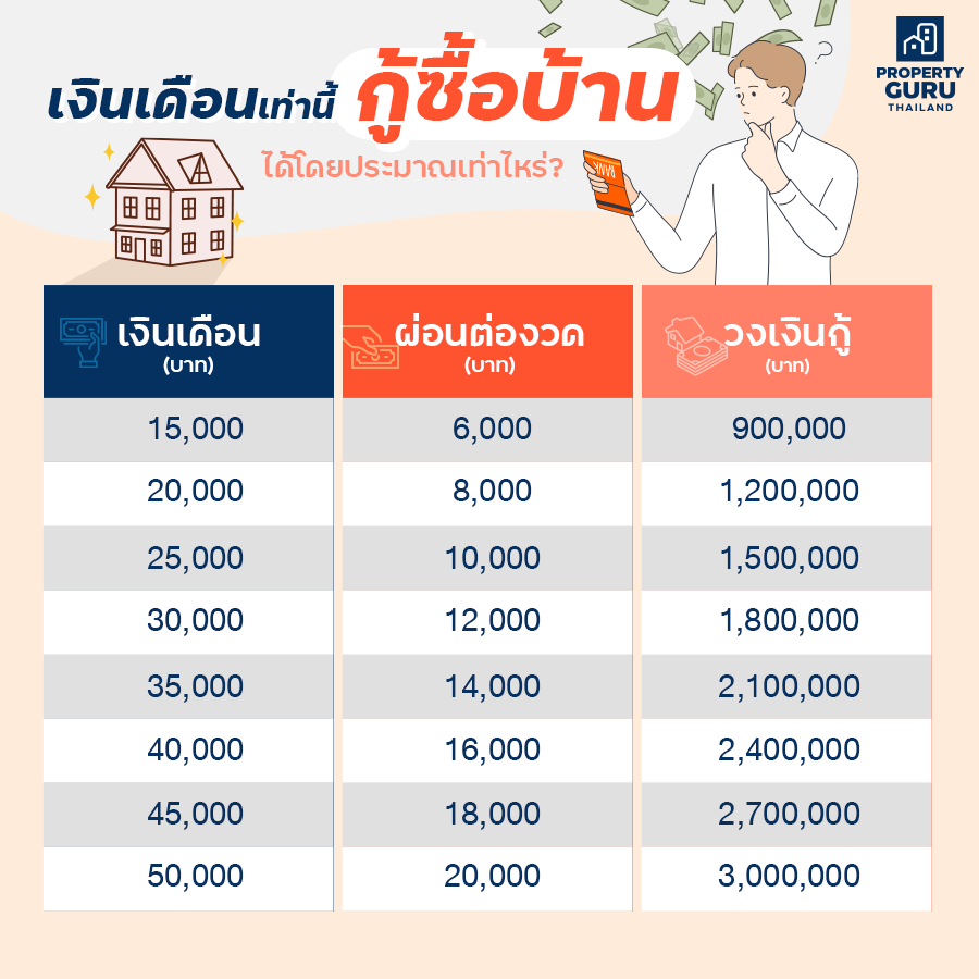 หลักการกู้ทั่วไปของธนาคารจะพิจารณาความสามารถในการผ่อนชำระของผู้กู้อยู่ที่ 40% ของรายได้ หรือประมาณ 15 - 25% ของรายได้ต่อเดือนหลังหักค่าใช้จ่ายส่วนตัว ยกตัวอย่างเช่น ผู้กู้มีรายได้ 20,000 บาท และไม่มีภาระค่าใช้จ่ายเพิ่มเติม ความสามารถในการผ่อนชำระ 40% ของเงินเดือนผู้กู้อยู่ที่ 8,000 บาท เป็นต้น ถึงแม้ว่าเกณฑ์มาตรฐานที่ธนาคารจะรับพิจารณาจะเป็นแบบในตารางข้างต้น แต่ในความเป็นจริงแล้วก็ยังขึ้นอยู่กับปัจจัยหลายๆ อย่างของทั้งตัวผู้กู้ เช่น อาชีพ, อายุ, ความมั่นคงของสถานที่ทำงาน การกู้ร่วม เป็นต้น และขึ้นอยู่กับโปรโมชั่นของโครงการ ณ ตอนนั้นด้วยเช่นกัน