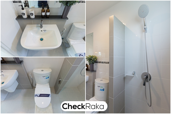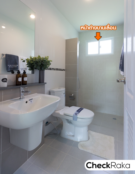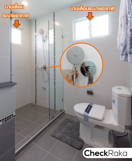 พื้นที่อาบน้ำแยกส่วนให้ชัดเจนด้วยฉากกั้นอาบน้ำ และมีบานเลื่อนระบายอากาศ 2 จุด