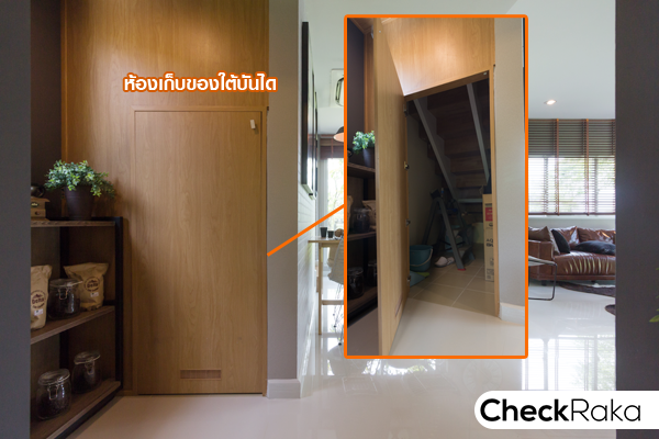 ตรงข้ามทางเข้าห้องครัว เป็นห้องเก็บของใต้บันไดขนาดเล็ก มีไฟด้านใน พร้อมประตูปิดเรียบร้อย