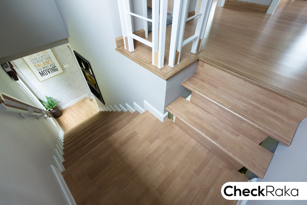 บันไดเป็นโครงสร้างเหล็ก พื้นบันไดและมือจับไม้สำเร็จรูป มีชานพักสี่เหลี่ยม 2 จุด