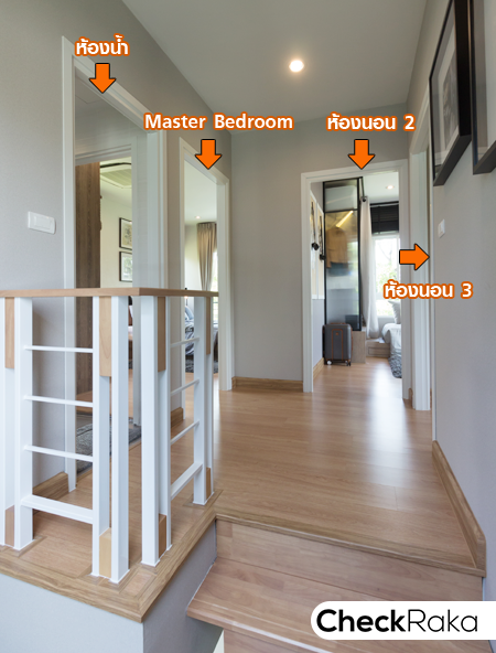 ถัดจากนั้นเป็น Master Bedroom และฝั่งซ้ายสุดคือห้องน้ำ พื้นชั้น 2 เป็นพื้นลามิเนต