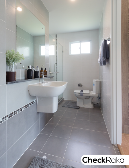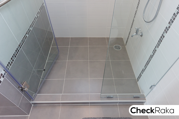 พื้นอาบน้ำส่วนเปียกลดระดับลงเล็กน้อย ปูกระเบื้องขนาด 12 x 12