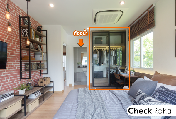 และทางเข้าห้องน้ำภายในห้องนอน จากรูปจะเห็นหน้าต่างบานเลื่อนตรงหัวเตียง และกระจกบาน Fix