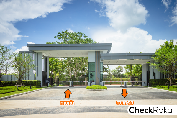 ซุ้มประตูโครงการมีขนาดใหญ่สไตล์ Modern มีหลังคาบังแดดและกันฝนได้ สะดวกสบาย