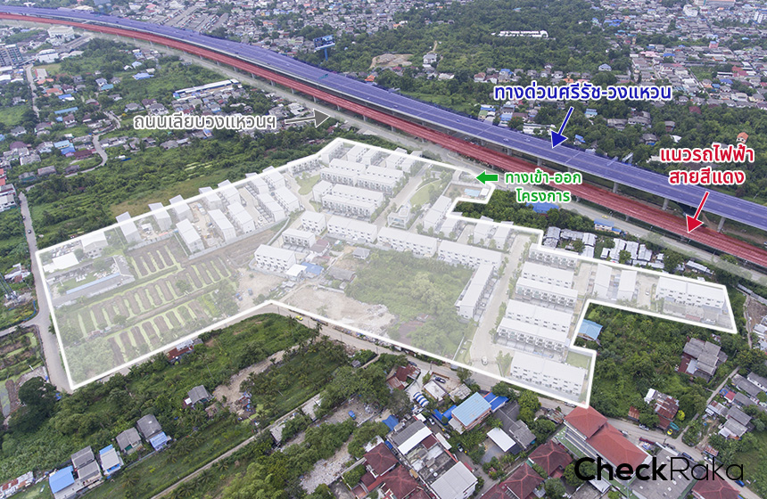 ตัวโครงการตั้งอยู่ติดถนนเลียบทางด่วนศรีรัช-วงแหวนรอบนอก ตำบลบางกรวย อำเภอบางกรวย จังหวัดนนทบุรี ใกล้ทางด่วนศรีรัช-วงแหวน และยังใกล้รถไฟฟ้าสายสีแดง ที่เชื่อมต่อไปยังสายสีน้ำเงินได้ สภาพแวดล้อมของโครงการส่วนใหญ่เป็นที่ดินเปล่าส่วนบุคคล ทำให้ย่านนี้ค่อนข้างเงียบสงบและไม่วุ่นวาย เหมาะกับการเป็นที่อยู่อาศัยที่แท้จริงทีเดียวค่ะ