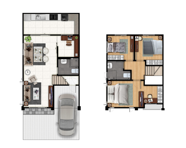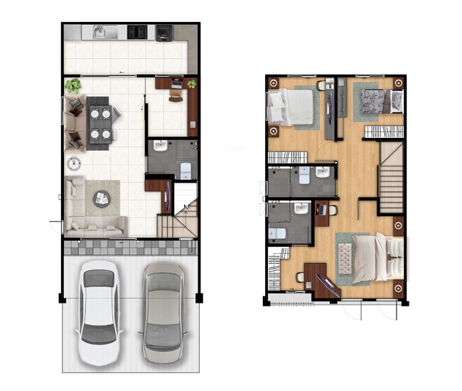 แปลนบ้านทั้งสองชั้นของแบบ 2 ที่จอดรถ